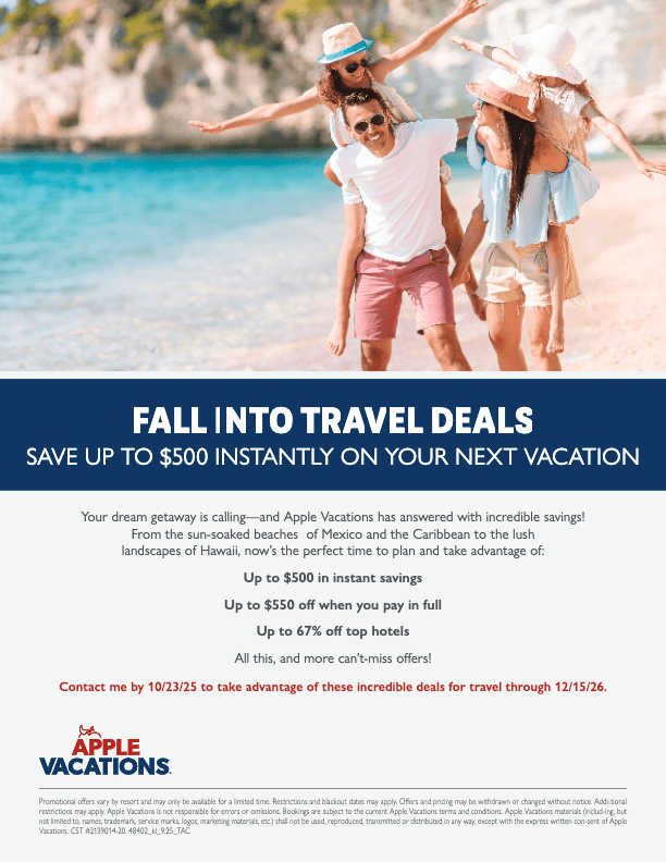 This October, Your dream getaway is calling—and Apple Vacations has answered with incredible savings!